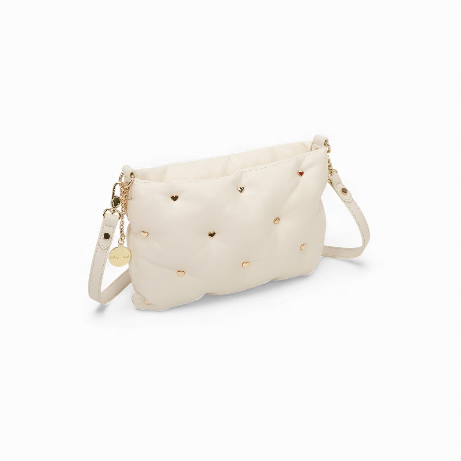 Elevate your style with the Mimi-Mua Shoulder Bag. The mimi-mua firenze brand clutch is crafted from luxurious faux leather and embellished with heart-shaped studs. Enjoy the convenience of the removable and adjustable shoulder strap for an even more sophisticated look.