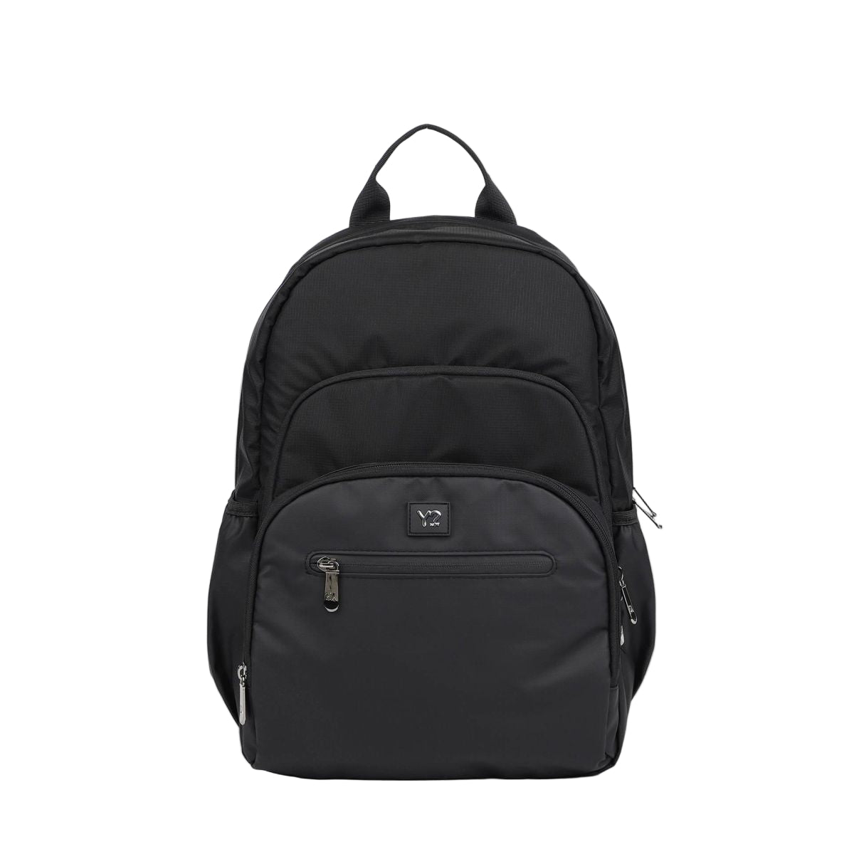 Zaino da ufficio con comparto porta PC con chiusura zip, interno organizzato con 2 tasche per oggetti. Include un comparto principale con chiusura zip, un interno ulteriormente organizzato con tasca zip, e uno spazio dedicato per accessori e porta penna. Dispone di un comparto secondario organizzato con chiusura zip e una tasca esterna per accessori anch'essa chiusa con zip. Realizzato in materiale idrorepellente per proteggere i tuoi effetti personali.